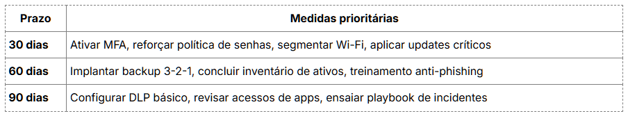 Treinamento: faça simulações rápidas de phishing e sessões curtas de conscientização a cada trimestre.