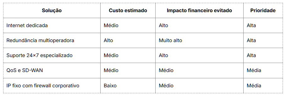 Se o investimento em internet dedicada com suporte especializado custa R$ 60.000 por ano e reduz as falhas em 80%, o custo evitado é de R$ 76.800.